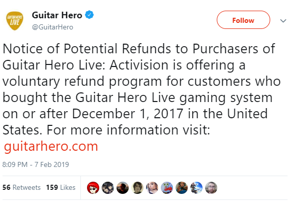 Activision has now announced a minority of customers (those in the US) can apply for a refund providing they bought Guitar Hero Live between December 2017 and January 2019. Players can apply for a refund by filling in a claim form, which can be found here..