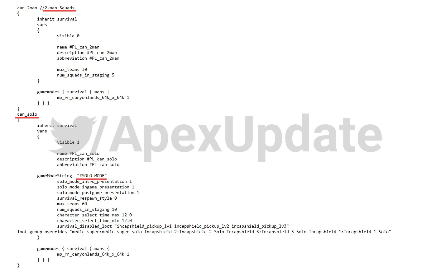 Rumour – Apex Legends will receive solo and duo game modes. EA and Respawn Entertainment have so far announced nothing on this subject. At the moment all that exists on the internet is this piece discovered by a data miner so take it with a pinch of salt till EA or Respawn Entertainment announce something.