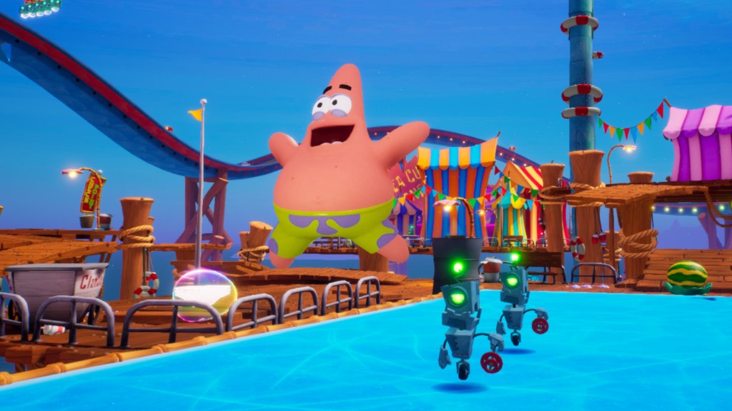 SpongeBob SquarePants Battle For Bikini Bottom Rehydrated puts you in the shoes of SpongeBob, Patrick and Sandy each with different abilities to traverse the multiple levels all brought in from the TV show, for example, Jelly Fish Fields, Merman and Barnacle Boys underground cave and much more. The story is that robots have invaded Bikini Bottom and you must put a stop to their attacks while also collecting Patricks Socks, Golden Spatulas and more items that help you progress through the game. The story is entertaining because of the cut-scenes between each moment and the many characters from the TV show you’ll get to meet and interact with. Most of the characters retain their original voice actors and act just like they do in the show and I admit I had a lot of laughs through-out. While the story isn’t the narrative quality of many blockbusters out there, it’s a lot of fun to follow and just actually get to be in Bikini Bottom and have a great time.